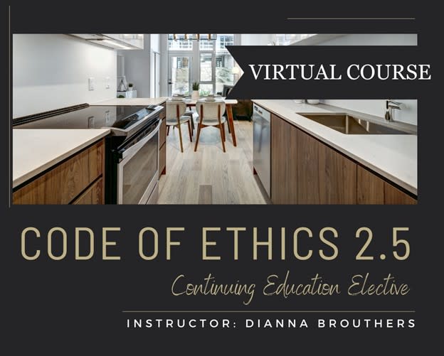 Description Credit Hours: 2 Hour CE Elective + NAR Code of Ethics Course #: DEE 3047 Instructor: Dianna Brouthers Price: $35.00 Class Description: This course is designed to meet NAR’s requirement of 2.5 hours of ethics training as well as the need for a 2-hour continuing education course. This course give an update to changes to the Code as well as a discussion of several “sticky situations” that are currently being seen in the marketplace.